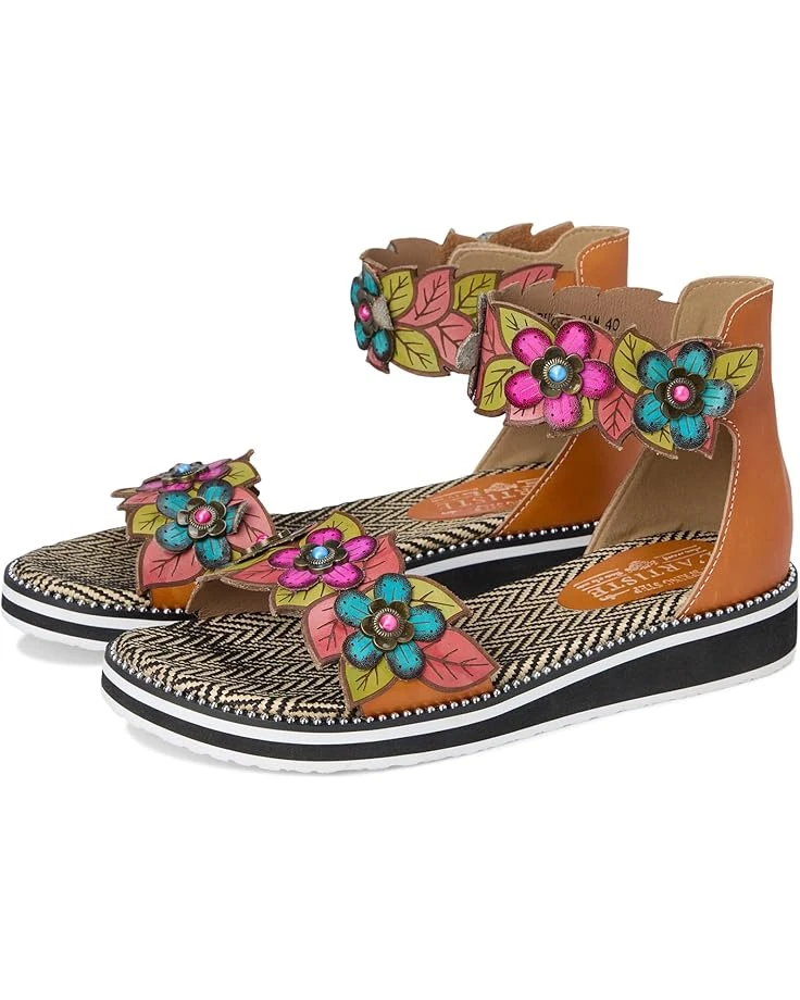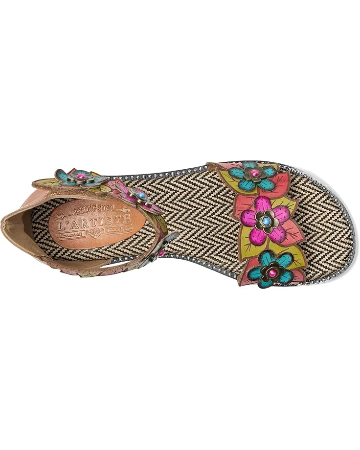 - With its open toe silhouette, closed-back design, this L’Artiste by Spring Step® Cruzer sandal lets your toes breathe while keeping your feet secure. The scalloped edge effect from the leaves on the straps, adorned with a mesmerizing combination of floral appliques and antique embellishments, creates a captivating, garden-inspired look.
