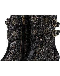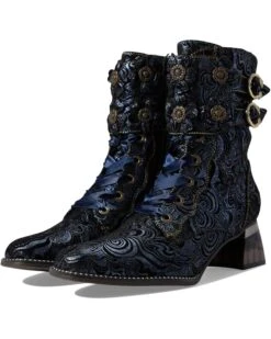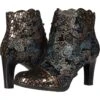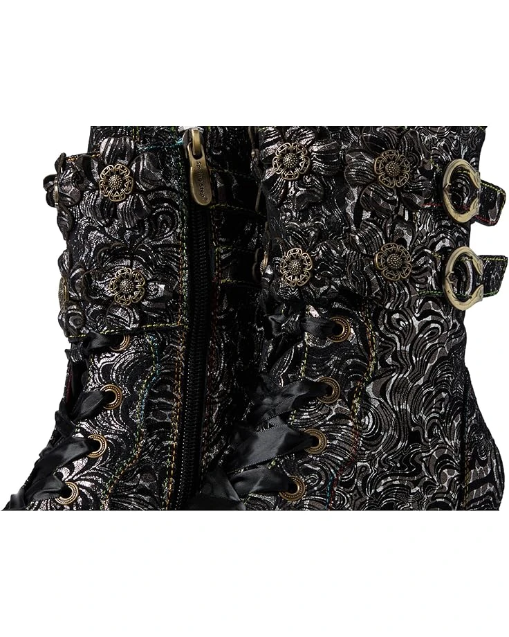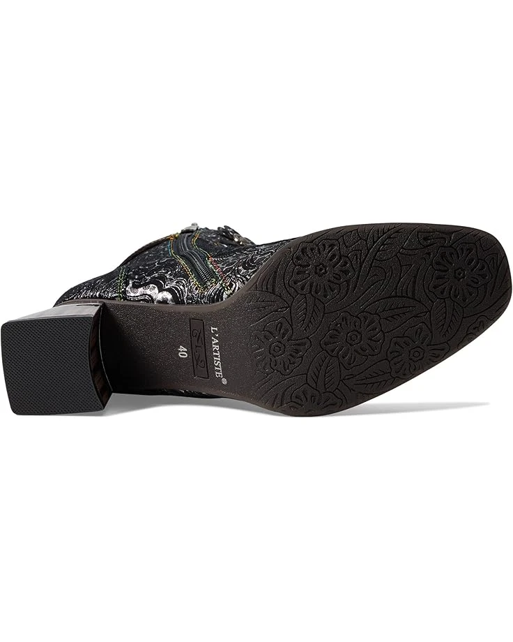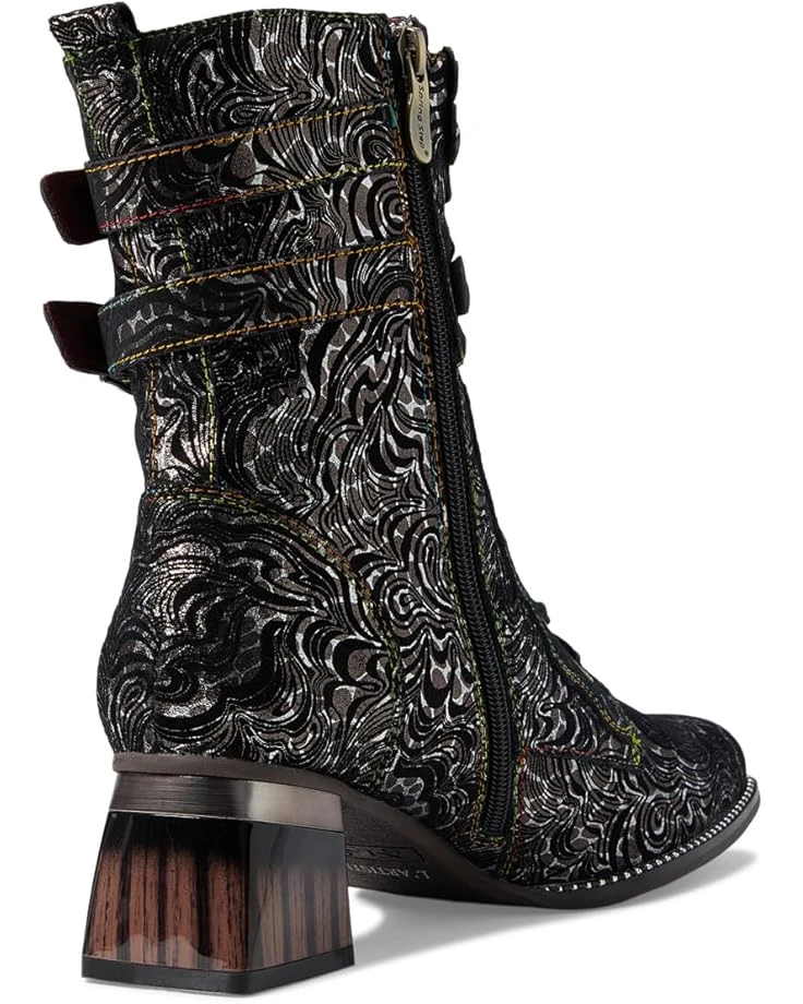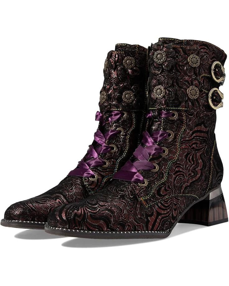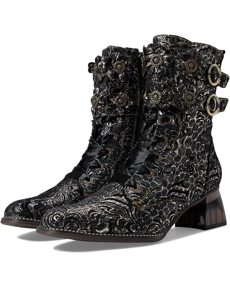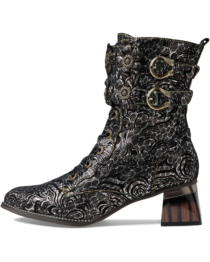 - Step into urban chicness with these antique style pop art-inspired metallic suede printed L’Artiste by Spring Step® Originala ankle boots with filigree button embellishments, dimensional applique flowers, and a shiny striated chunky pewter trimmed heel. Boasts matching ribbon laces and inside zippered side closure, paisley printed velvet lining, and a padded footbed for all-day comfort.