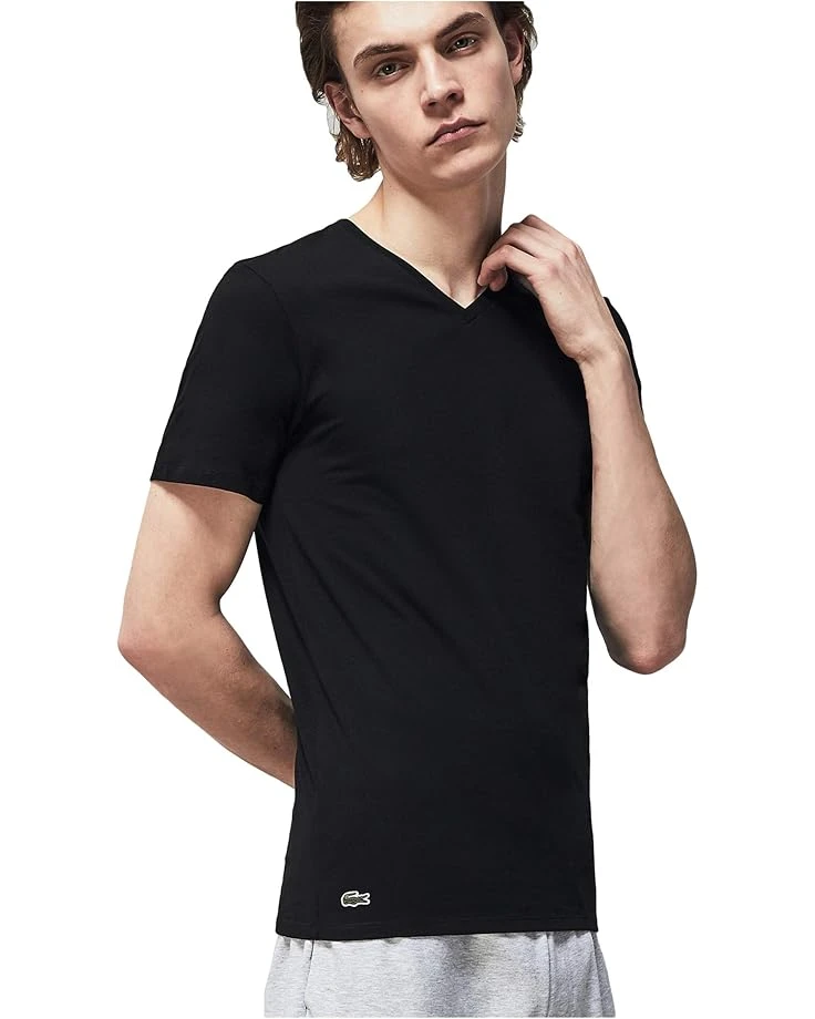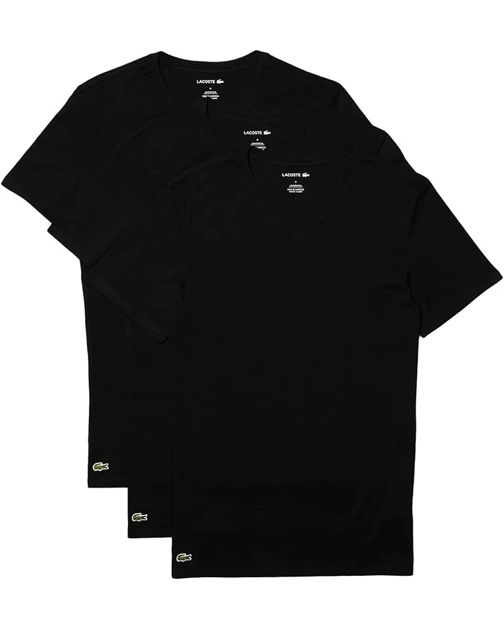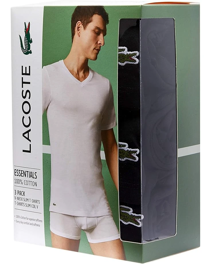 - The Lacoste® 3-Pack V-Neck Regular Essential T-Shirt combines a clean design and comfort for everyday wear. These undershirts are crafted in the superior softness of pure cotton, and are detailed with the signature green croc at the hem.